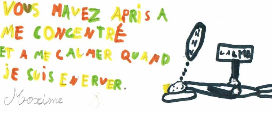 Au gré des rencontres, nous proposons une série d’exercices simples et utilisables en classe pour se calmer, améliorer sa concentration, développer la confiance en soi et se rendre présent aux autres. En nous inspirant du Brain Gym, du yoga, des massages shiatsu et de la respiration en pleine conscience, nous construisons un rituel quotidien avec les enfants et les enseignants pour aborder les apprentissages et travailler ensemble avec sérénité.